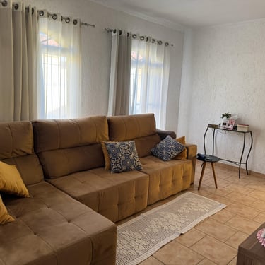 Sala: estar/jantar integradas, em L na sala da casa da frente.