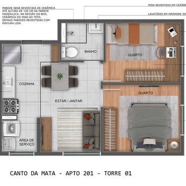 Cerâmica nas áreas da cozinha e banheiro